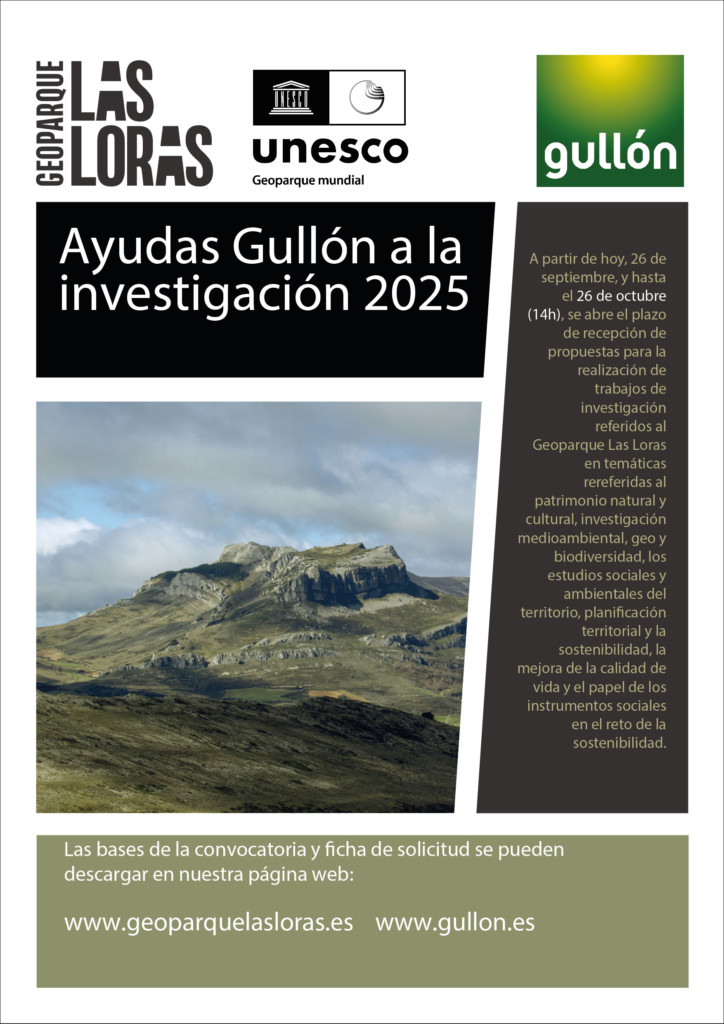 INVESTIGACIÓN PARA PONER EN VALOR UN ENTORNO ÚNICO. En concreto, la Beca Gullón a la investigación en el Geoparque Las Loras 2025, dotada con un máximo de 4.000 euros, tendrá en cuenta los contenidos y el carácter innovador de los proyectos, la paridad de los equipos y su repercusión para el Geoparque. El plazo de presentación de solicitudes comprenderá desde que se publique la convocatoria en la página web del Geoparque este 26 de septiembre hasta el 24 de octubre a las 14 horas, dándose a conocer la decisión final no más tarde del 10 de noviembre